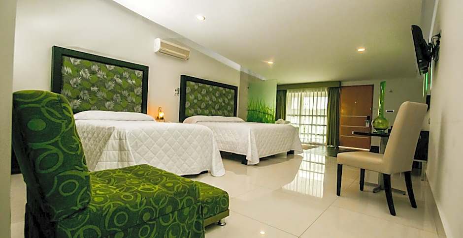 The Hotel María Dolores San Luis Potosí offers a variety of rooms including Twin Rooms, Junior Suites, Deluxe Double Rooms, Double Rooms with Garden View, Suites with Hot Tub, and Suites with Spa Bath. All rooms have a size of 269 sqft and smoking is not allowed. The rooms can accommodate either 4 adults and 2 children or 2 adults and no children, with bed options including 2 double beds or 1 king size bed.