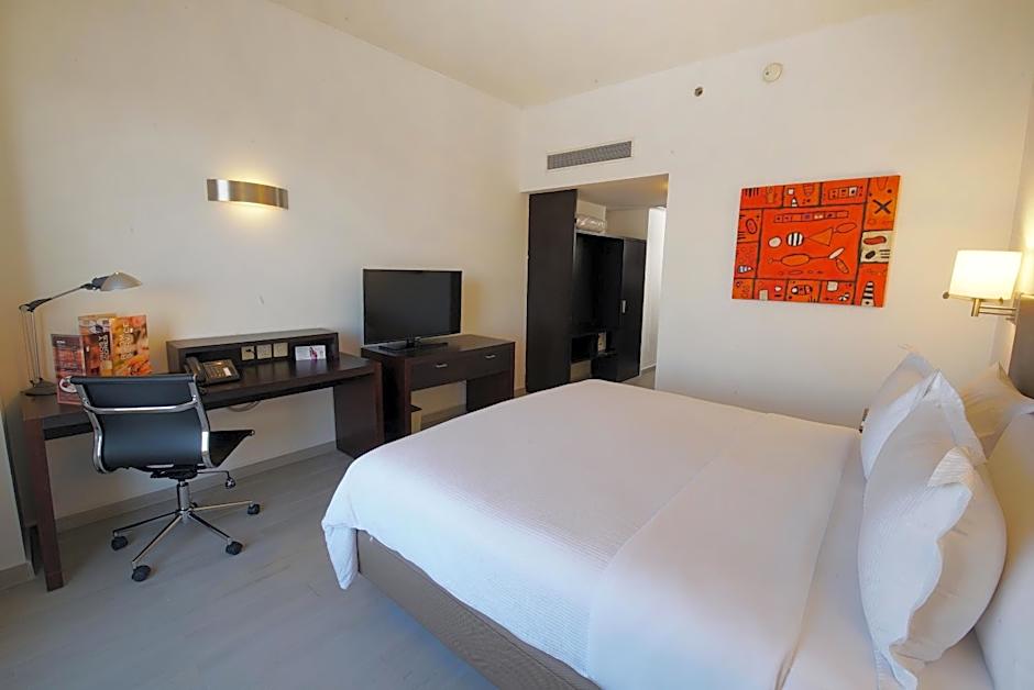 This room features 1 king-size bed, TV, desk with a chair, telephone and city views. The bathroom has bath tub.