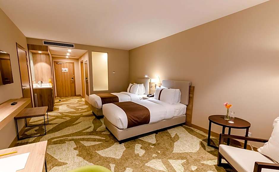 The hotel offers a variety of room types including Double or Twin, Twin, Standard Double, King Suite, and Executive King Room. The rooms can accommodate 2 adults and 1 child, except for the King Suite which accommodates 3 adults and 2 children. All rooms are non-smoking and offer a range of bed sizes including Queen, Double, and Twin, with room sizes ranging from 334 to 592 sqft.