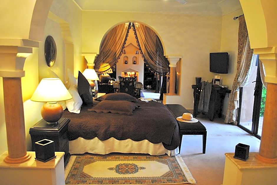 This room is decorated in warm earth tones and has a private terrace with views of the garden, pool and Atlas Mountains.
