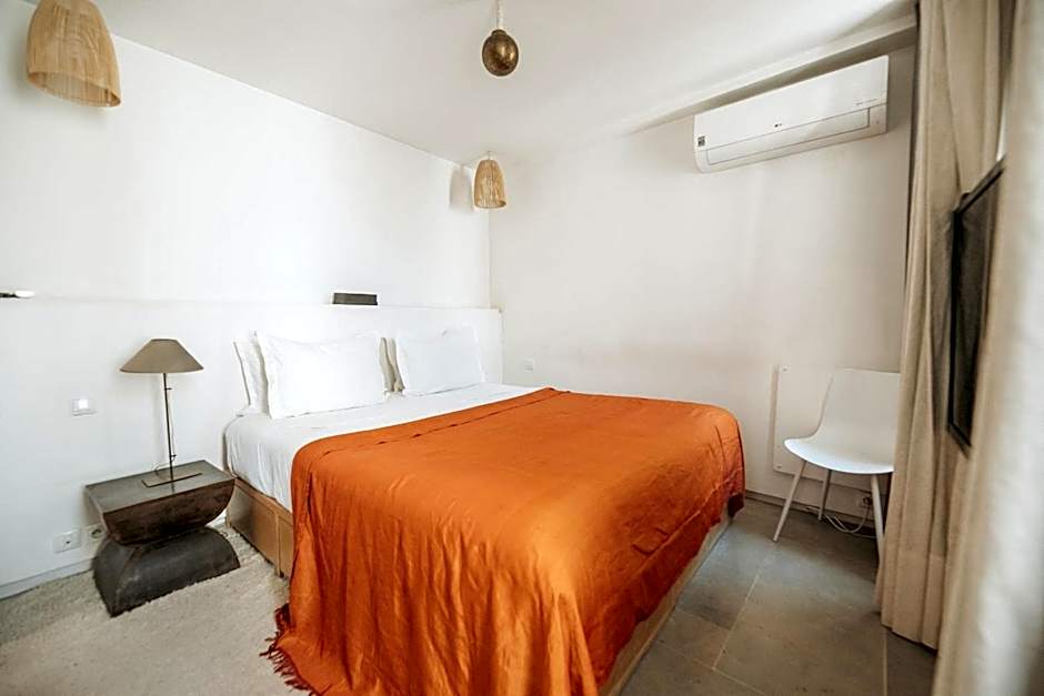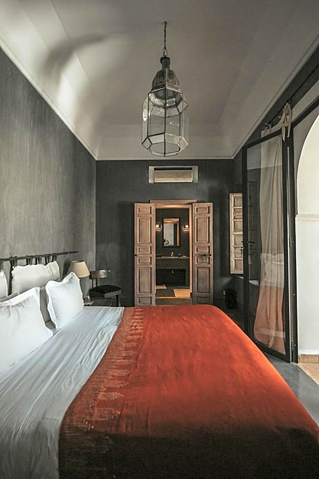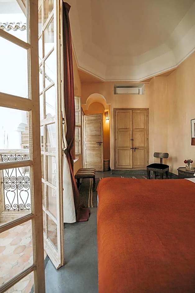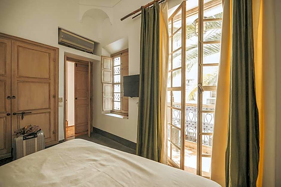 This room features a queen-sized bed with Eqyptian cottons heets, a small balcony with views of the pool and tree-lined courtyard. The private bathroom includes aqua-green zelliges tiles from Fes.
