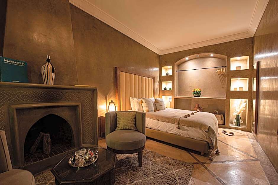 Room choices include Suite, Fountain View, Groundfloor; Deluxe; and Deluxe Suite. The Deluxe Suite spans 323 square feet and includes a Queen-size bed, accommodating 2 adults and 1 child. Other options—Suite with Fountain View on the Groundfloor and a standard Deluxe—provide additional layouts for couples or small groups, each pairing comfort with the distinctive Marrakech atmosphere.