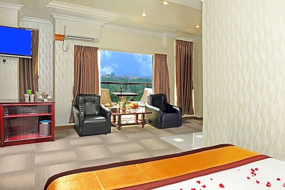 Large air-conditioned suite features a private balcony with a seating area and views of Shwedagon Pagoda. It has a sofa seating area, a flat-screen TV and an private bathroom with a bathtub.