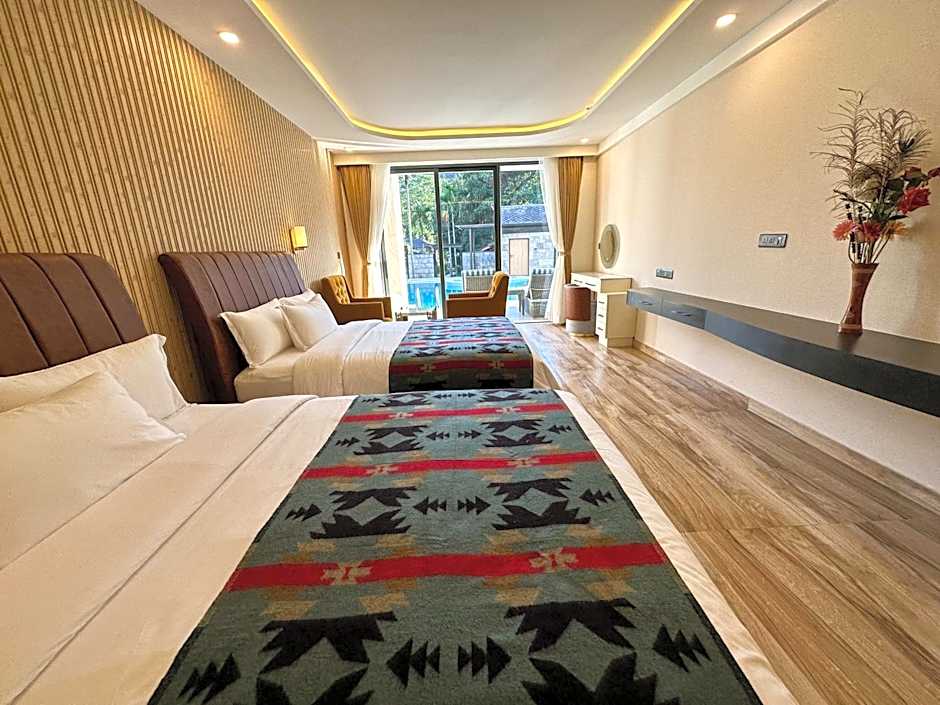 Providing bathrobes, this double room includes a private bathroom with a shower, a hairdryer and slippers. The spacious air-conditioned double room provides a flat-screen TV with cable channels, a tea and coffee maker, a seating area, a wardrobe as well as pool views. The unit offers 2 beds.