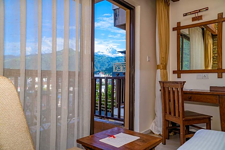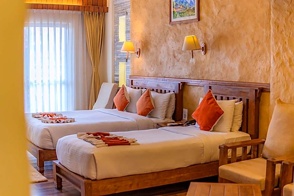 Rooms come with balconies and a kitchenette with kitchenware, offering mountain, lake, garden, or landmark views. A terrace adds outdoor space to enjoy Pokhara’s scenery, while a range of accommodations—from Superior and Deluxe options to Suites—cater to different needs, including setups with multiple beds for families or groups.