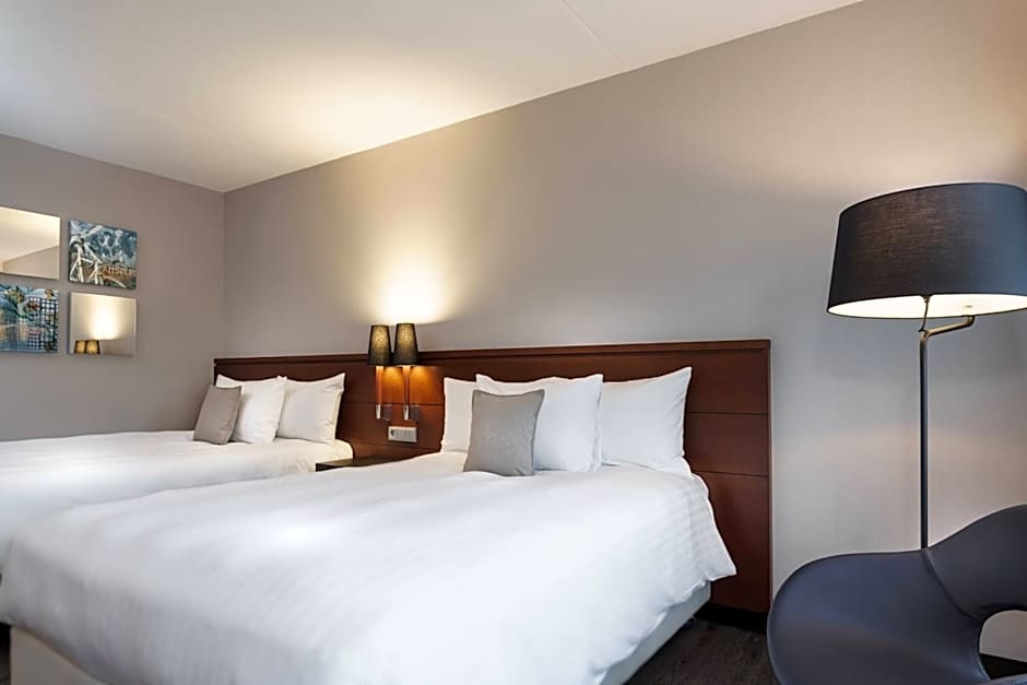 This room features 2 Queen size beds, business desk with ergonomic chairs and USB plug connections, a 48 inch Smart TV with Guest Room Entertainment, and Chromecast streaming on every device for Netflix, Spotify, Youtube and Momocast. Free WiFi is included. Extensive views of the green Haarlemmermeerse Bos surroundings.