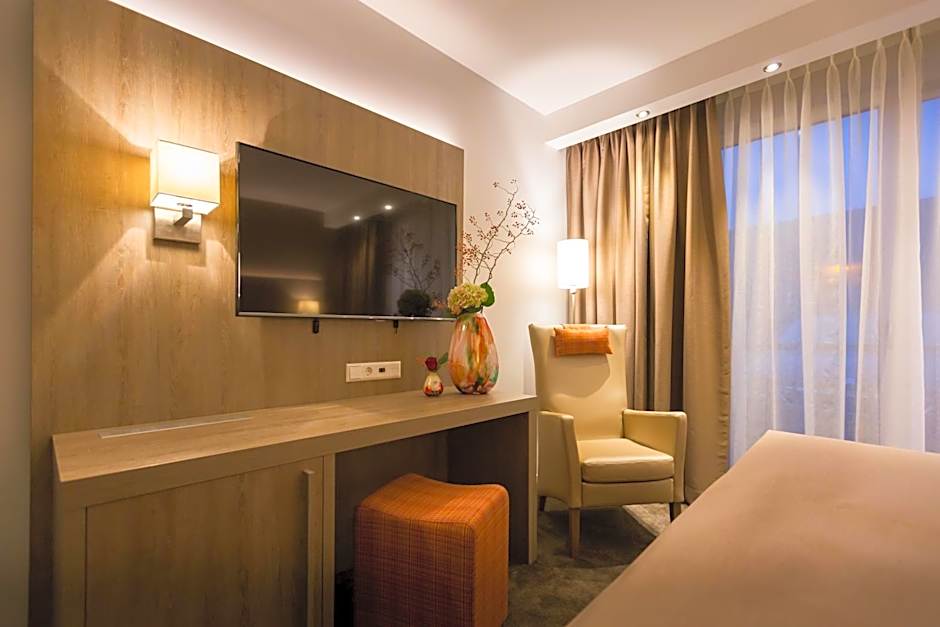 This soundproof Comfort Double Room with Spa Bath has a 48" smart flatscreen TV with internet connection cable and 500 mbit/s high speed. Furthermore there are coffee and tea making facilities. The private bathroom has a walk-in rain shower, whirlpool, toilet, wash stand and hairdryer. The bedroom has bedding with a cold foam top deck.