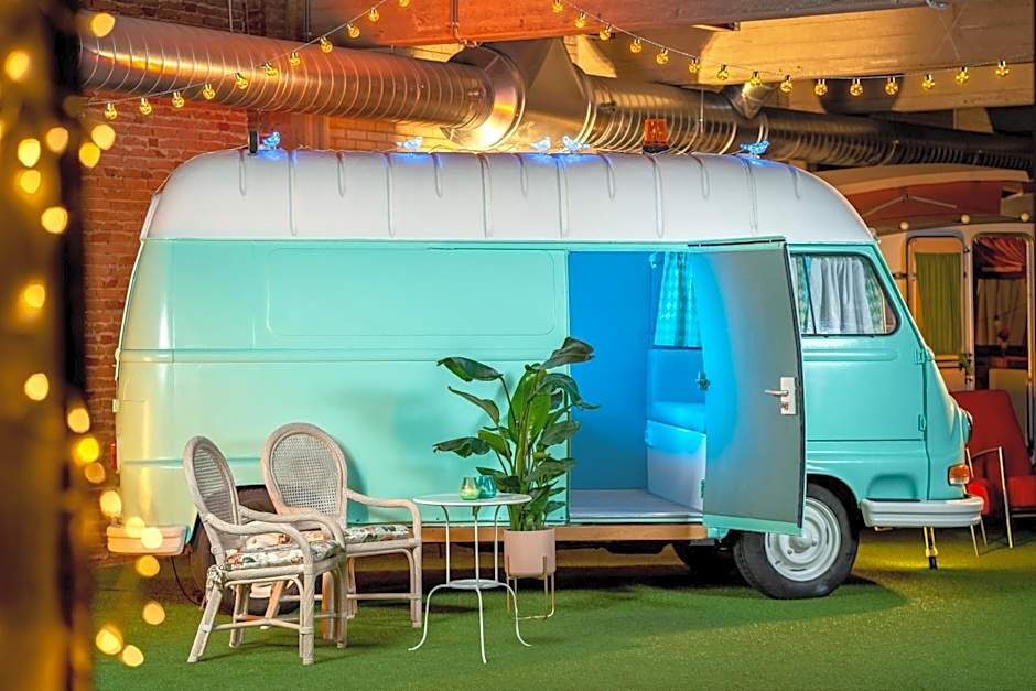 Room choices showcase playful variety. The Barrel offers a compact 75 sq ft space with a queen bed for two, while the House, 2 Twin, Beach View measures 75 sq ft with two Twin beds plus a queen bed and beach views. Other options include the Deluxe Double Room (75 sq ft, queen bed, accommodates 2 adults and 1 child), Modern Vintage (75 sq ft, queen bed), and Modern (75 sq ft, queen bed). For those seeking extra space, Camping rooms run 97 sq ft with two Twin beds, and Camping, 2 Twin also features two Twin beds.