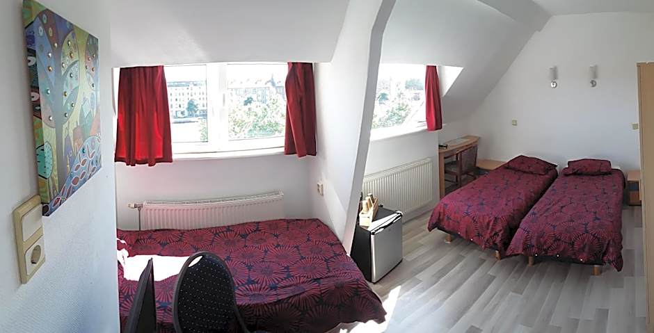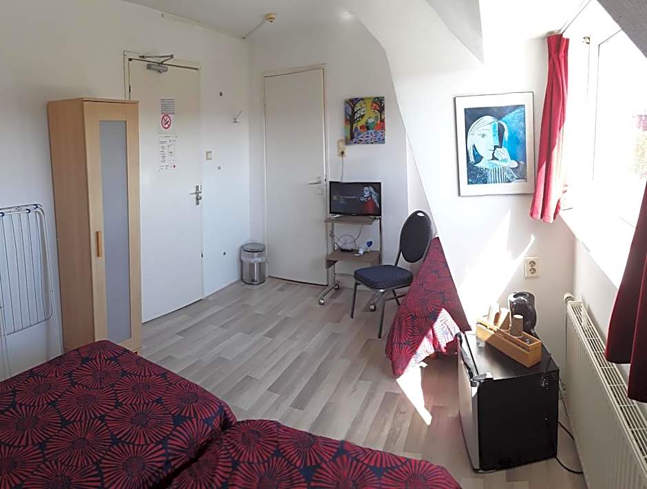 This double budget room could be perceived as a quite small room. The room is equipped with shower toilet and sink, the room has television and a small desk and a locker. Like all rooms the room is equipped with free WiFi. The room is located on the garden side on the first floor. The bed size is a small 2 personsbed.