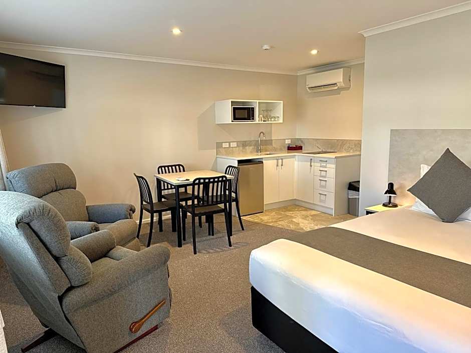 This studio features a kitchenette with microwave, refrigerator and tea and coffee maker, and a seating area with flat-screen TV.