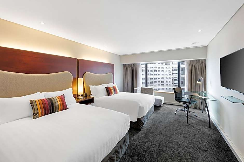 The Crowne Plaza Auckland offers a variety of room types, including Twin rooms with 2 Queen size beds, Double rooms with 1 King size bed, and Quadruple rooms with 2 Queen size beds. The rooms range in size from 323 sqft to 344 sqft. Smoking is not allowed in any of the rooms. The rooms can accommodate between 2 and 3 adults, and 1 to 2 children.