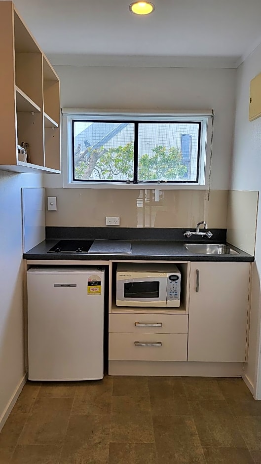 Features kitchenette facilities with microwave and fridge, and a private bathroom with shower.