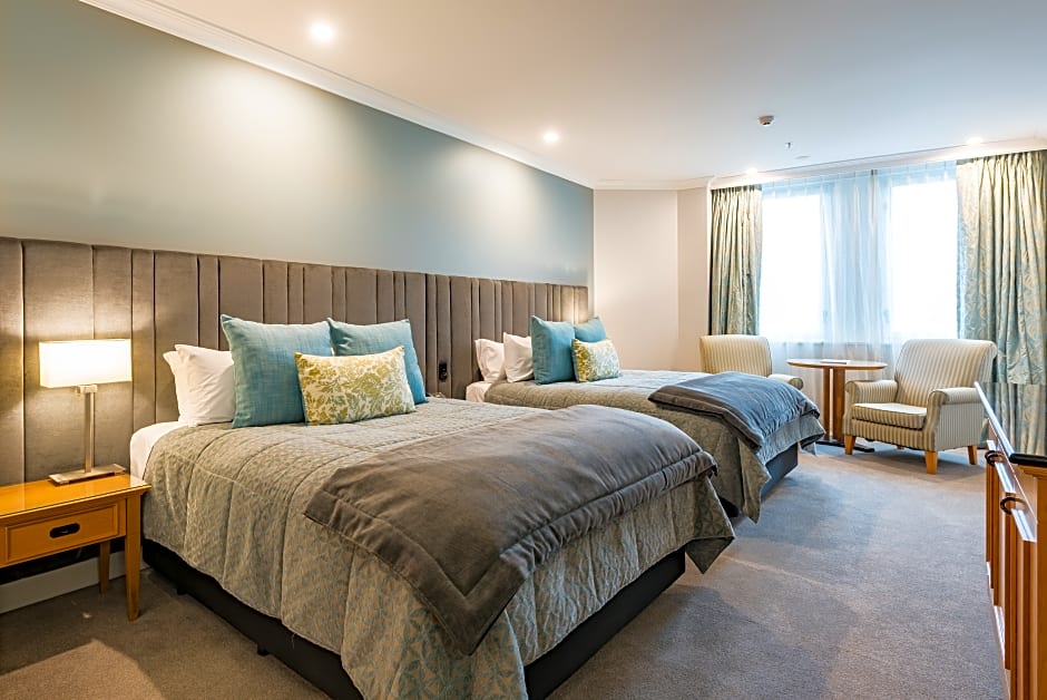 These refurbished, air-conditioned rooms offer 2 Queen beds combined with luxurious linen as well as double glazed windows to ensure a restful night’s sleep. The modern private bathroom is equipped with a spacious walk-in shower featuring both standard and rain shower heads. Armchair, a desk and work space, wall mounted 55-inch flat screen television with satellite channels and free unlimited WiFi is also offered.