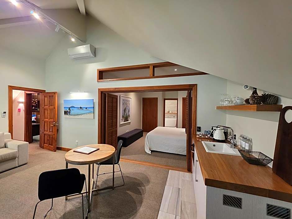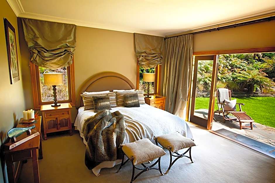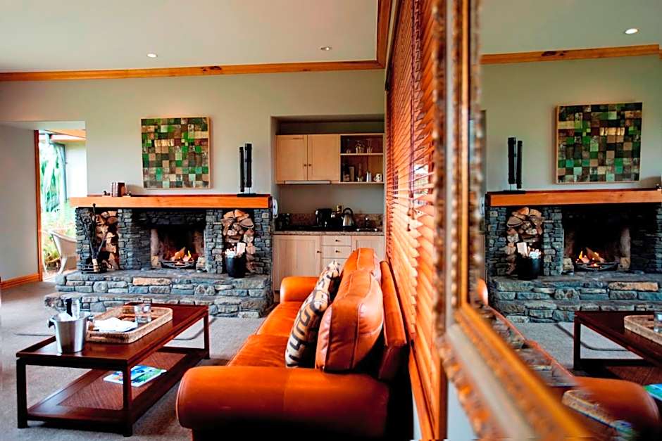 The Forest Villas, measuring 132 sqm, offer a high level of privacy and are located closest to the main lodge, accessible via a short forest track. Nestled within the forest, the villas immerse you in the sounds of bird calls and nature. The floor-to-ceiling windows provide views of the native trees and ferns, and each villa includes its own outdoor sitting area. A private entrance leads into an open-plan lounge and bedroom, featuring a stone open fireplace, mini-bar, dining table, and satellite TV. Luxurious marble bathrooms feature an oversize jacuzzi, a separate shower, and 100% natural toiletries. All villas offer hypoallergenic linens, a King bed or two large single beds, allowing for flexible accommodations options.