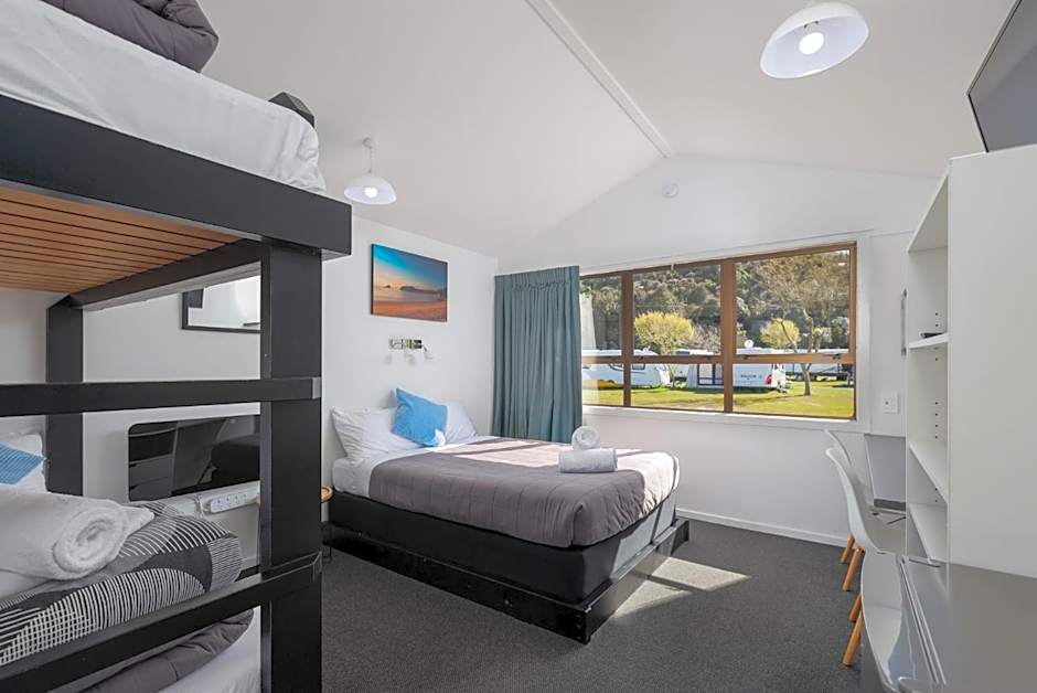 Accommodations span several styles to fit different group sizes, from the Budget Twin with two bunk beds at 161 sqft to the Economy Quadruple at 194 sqft with a double bed plus two bunks. Family Cabin offers more space at 215 sqft for two adults and one child, while Family Chalet suits couples with comfortable space. Other options include Budget, 2 Bed and Economy Cabin for varied needs, making it easy to pick a base that fits the beachy Kaiteriteri getaway.