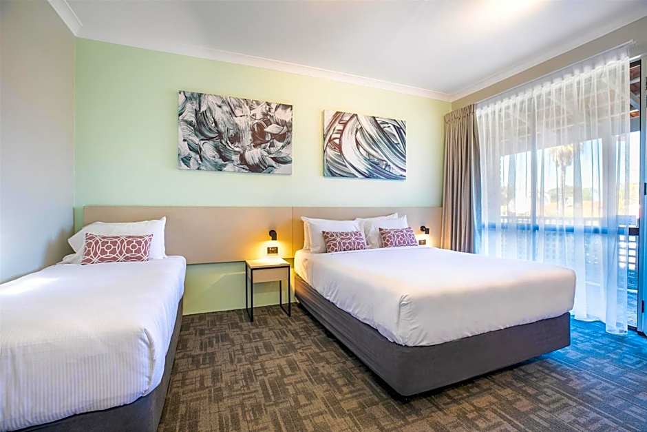This apartment includes a queen bed and a single bed in a separate bedroom. There is also a single bed in the lounge area. It features a full kitchen, spacious bathroom and air-conditioning.