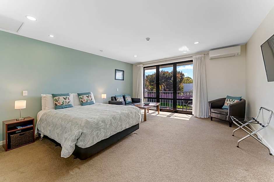 Features a spa bath in the bathroom, private sunny balcony or tiled garden courtyard, plus a large seating area with sofa or armchairs. The kitchenette has a microwave, refrigerator and coffee plunger.
