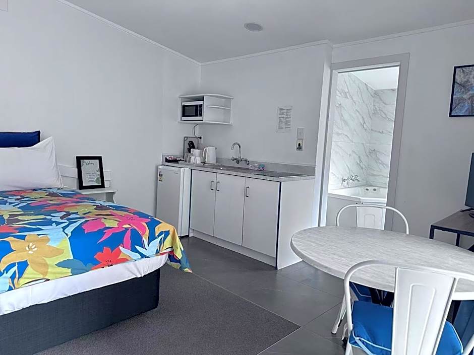 This studio features a small kitchenette and a fully private bathroom with a shower and a spa bath.