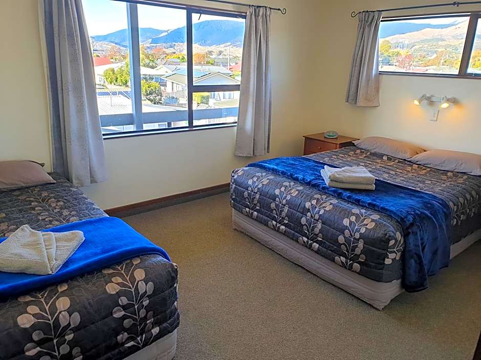 This upstairs apartment is self-contained with a private balcony area, satellite TV and free WiFi. It has a queen bed in the first bedroom, a queen and single bed in the second room, 1 double and 1 single bed in the third room with a single bed in the lounge area. It is serviced daily with towels and tea/coffee.