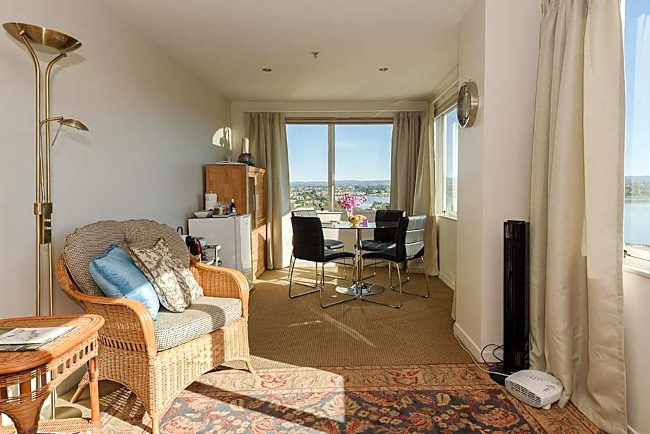 This top floor apartment features a large king-size bedroom with views over the park, inner harbor and hills in the distance. It includes a flat-screen TV, wardrobes and ironing facilities.