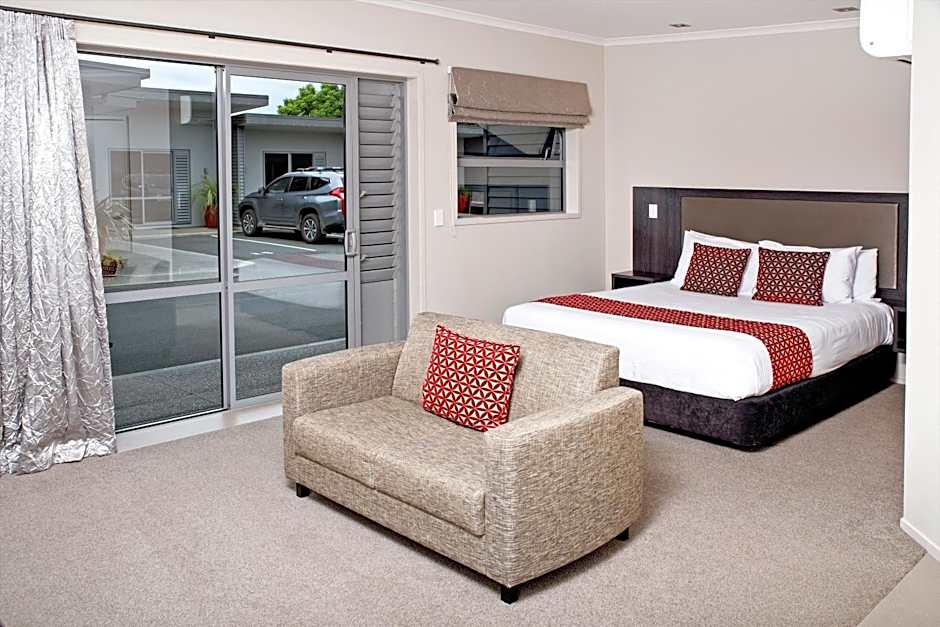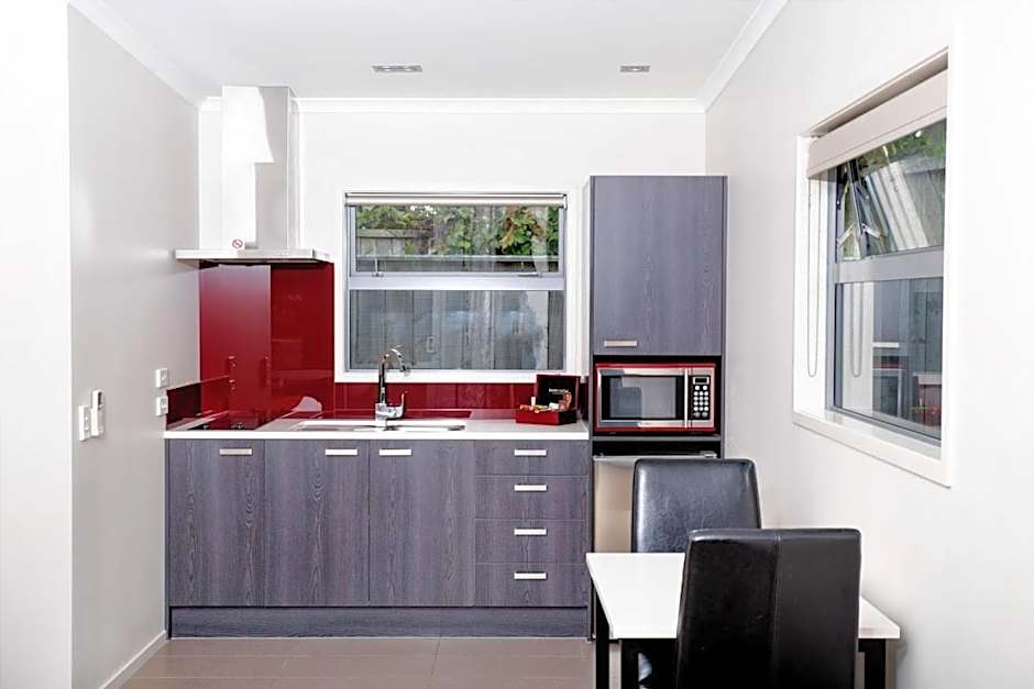 Room has designated parking outside the door. A 42-inch flat-screen TV. There is no electric hob for cooking. The kitchen has a fridge, microwave, kettle and toaster. Cooking utensils, crockery and glassware are provided. The private bathroom has a large walk-in shower with handrails and seating. The studio has 1 x king bed and seating. Maximum occupancy is 2. The king bed is unable to be split into single beds.