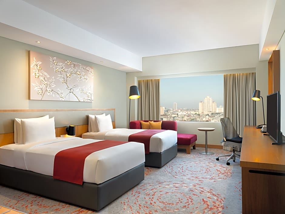 Og mens du nyter de luksuriøse fasilitetene, ikke glem å benytte deg av den flotte utsikten fra utvalgte rom. Velg mellom ulike romslige innkvarteringer, inkludert suiter med ett soverom og familievennlige rom med kjøkkenkroker, slik at du har god plass til å boltre deg og nyte oppholdet. Enten du er her på en romantisk ferie eller en morsom familieferie, skaper Holiday Inn & Suites Jakarta Gajah Mada en atmosfære av glede og komfort som vil få deg til å komme tilbake. Eventyret venter—du må bare bestille det!