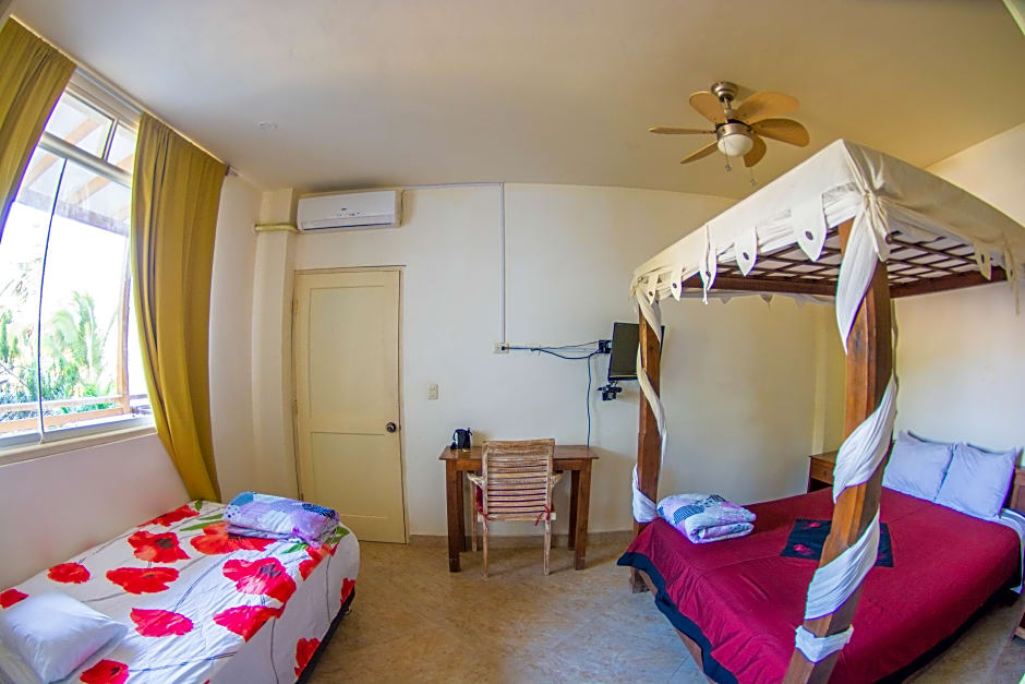 This room features a queen-size and a single bed, flat-screen satellite TV, ceiling fan, air conditioner and private bathroom.