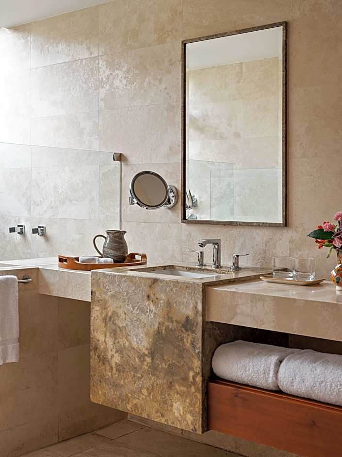 Garden Junior Suites combine Peruvian colors with European minimalistic décor. These rooms feature a luxurious bathroom with large, slanted windows and a seating area.