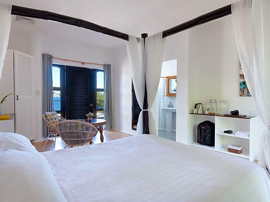 Featuring a private balcony with views of the garden, this room comes with a four-poster queen-sized bed. The main entrance provides views of the ocean and pool area. The private bathroom offers shower facility.