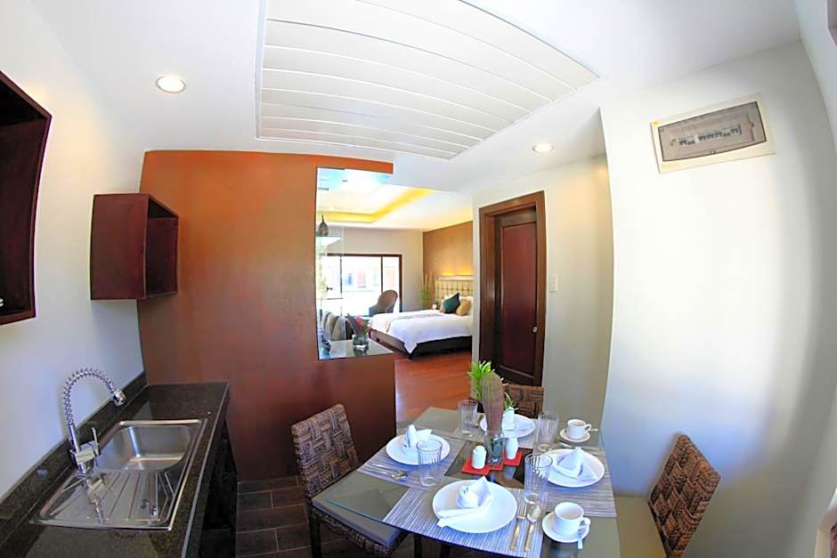 This suite features a terrace with direct views of the pool. It is equipped with air conditioning, a flat-screen TV with cable channels, and a safety deposit box. The room also includes a sofa seating and a kitchenette with a dining area. The private bathroom has a shower facility with free toiletries and a hairdryer.