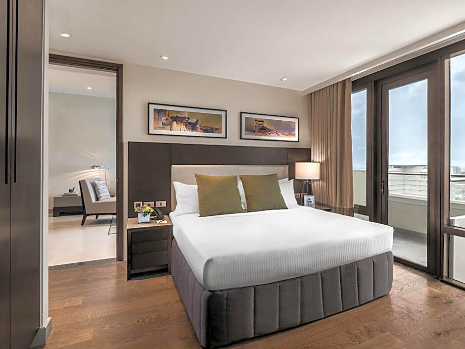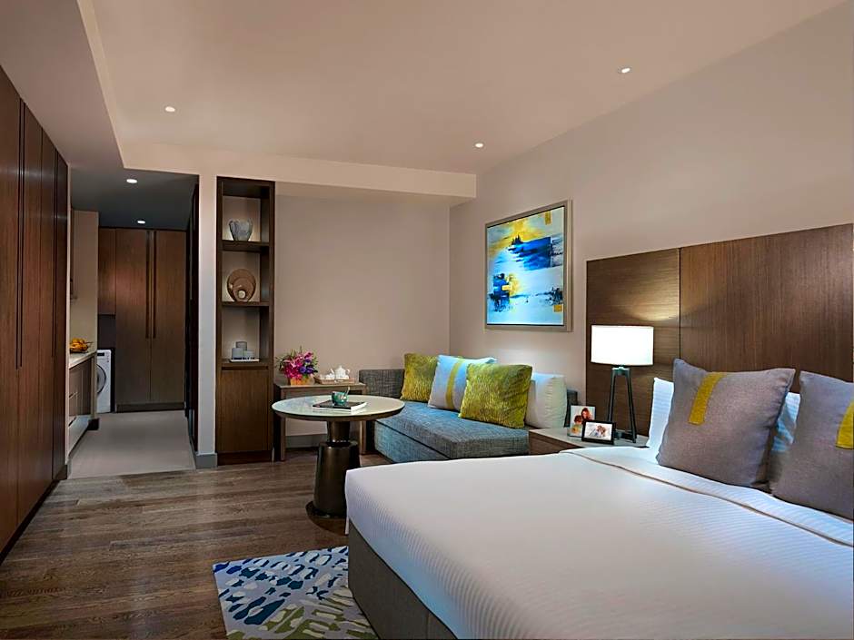 The hotel offers a variety of room types including One-Bedroom Deluxe with a King size bed and 603 sqft in size, and Studio Premier with a King size bed and 463 sqft in size. Smoking is not allowed in any of the rooms. The accommodations typically accommodate 2 adults and 1 child, with varying bed sizes and room sizes.