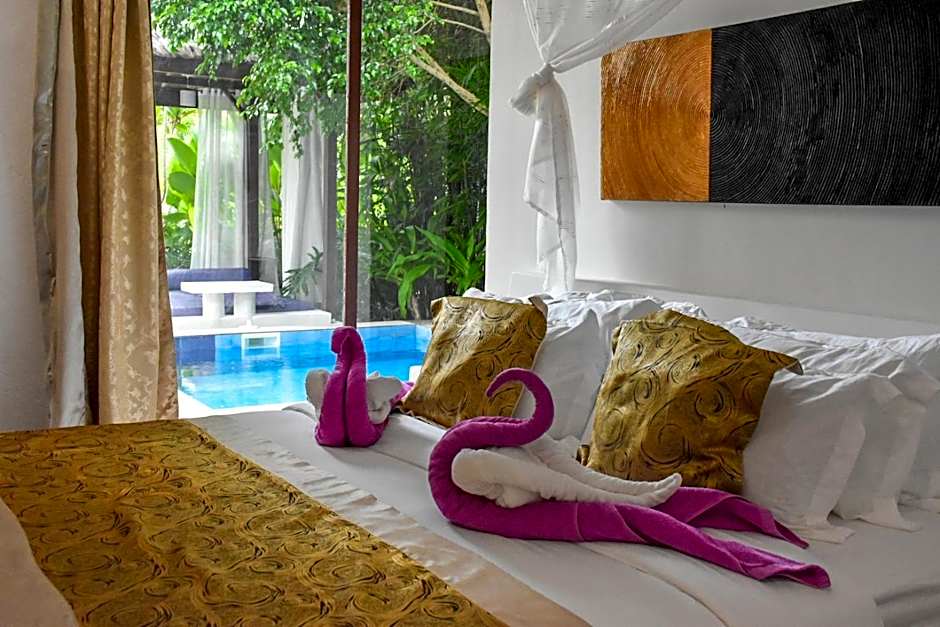 Accommodations span a range from Deluxe and Executive rooms to Villas, including options like Villa with Private Pool. Some units feature balconies or bathtubs, and suites with pool access add an extra touch of luxury. Payments are cash only.