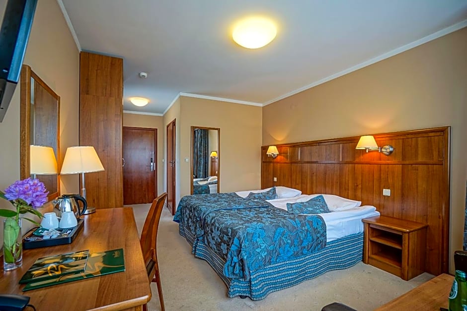 Elegant room in natural colors, featuring a flat-screen TV with satellite channels, a safe and Farmona cosmetics. Bottled mineral water is offered in the room free of charge. There is WiFi.