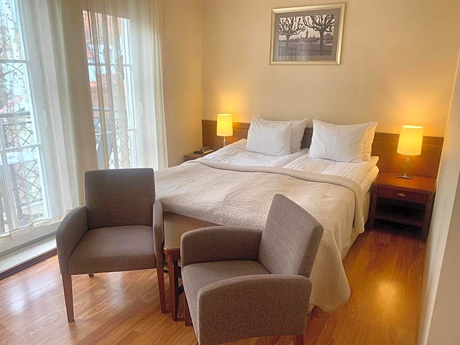 Extra spacious room with a seating area and a balcony. Coffee, tea and water are provided for free.