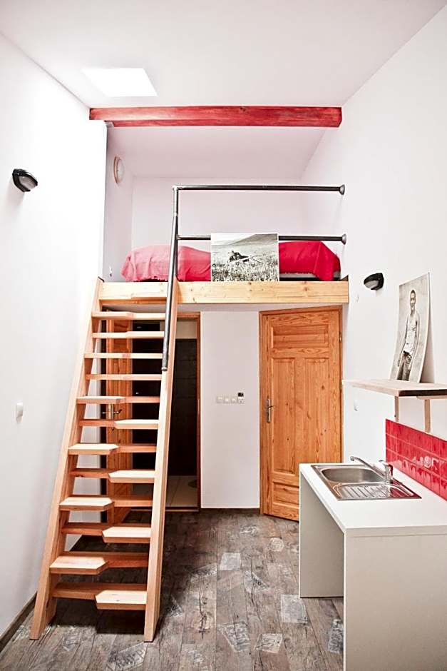 This modern room features a mezzanine and a kitchenette with a fridge, a microwave, a table with 2 chairs and a flat-screen TV. Extras include kitchenware, tea and coffee. There is also a bathroom with a shower and 2 small towels.