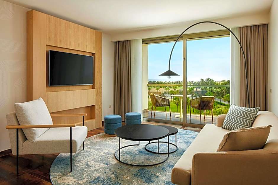 This spacious suite is consisted of of 1 living room, 1 separate bedroom and 2 bathrooms with a shower and free toiletries. The air-conditioned suite offers a flat-screen TV with cable channels, a mini-bar, a tea and coffee maker, a wardrobe as well as sea views. The unit offers 2 beds.