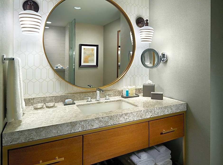 Três opções de refeições no local permitem que os hóspedes saboreiem os favoritos da culinária americana em diferentes atmosferas: o Lobby Wine & Coffee Bar traz uma vibe americana moderna para um lanche chique e descontraído; o National Anthem serve pratos americanos contemporâneos para um jantar leve; e o 582 Waterside Lounge & Bar (SAZONAL) oferece um espaço familiar para refeições e bebidas casuais. Cada estabelecimento tem seu próprio estilo, facilitando as refeições, seja para colocar a conversa em dia com colegas ou repor as energias após um dia explorando a cidade. Para um gole rápido, o bar no local é uma parada conveniente antes de sair para conhecer as atrações de Atlanta.