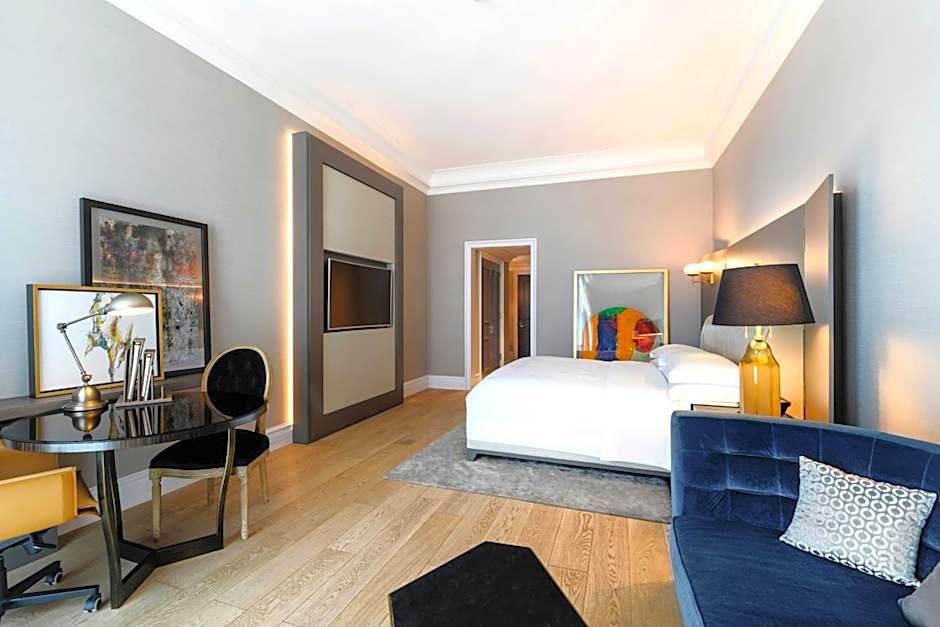 The spacious suite features an elegant decor with velvet and silk wall coverings and an extra large double bed. It has a separate lounge with a satellite TV and a mini-bar. The suite includes a private bathroom with bathrobes and slippers, and a steam shower.