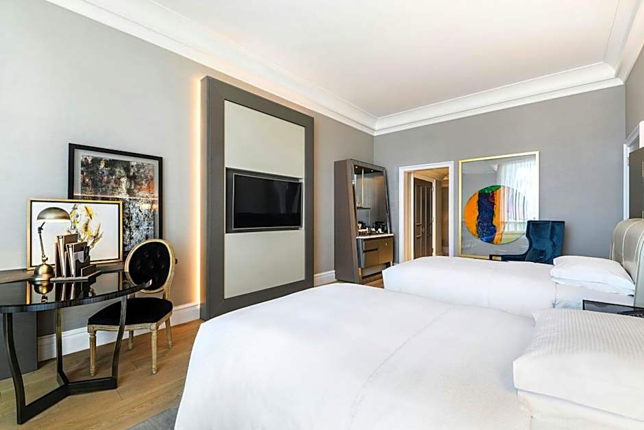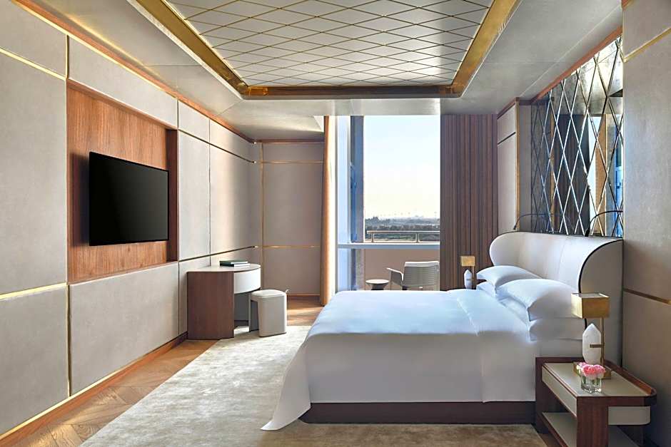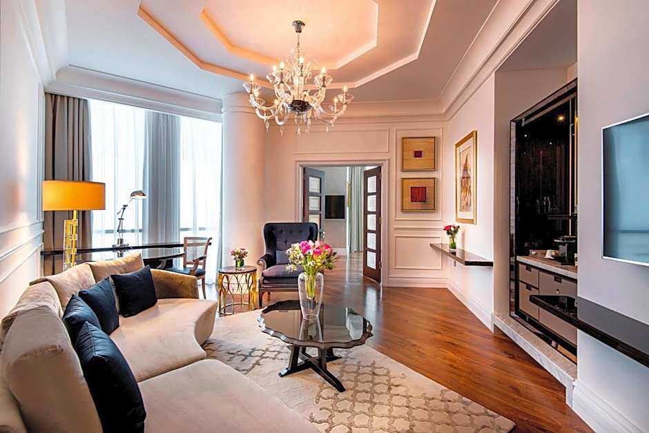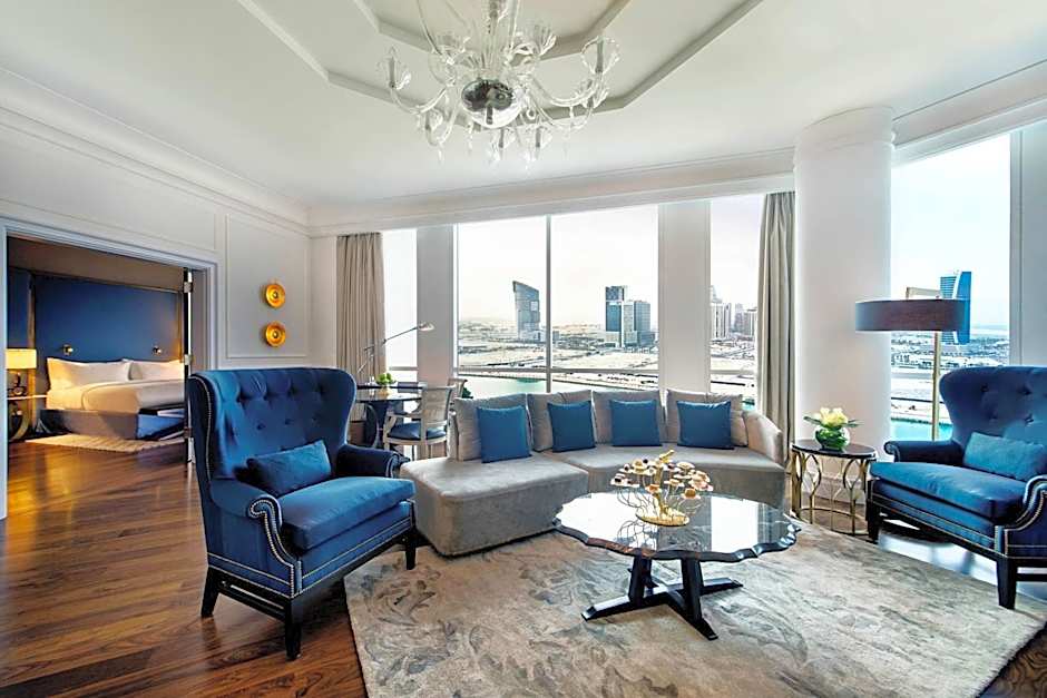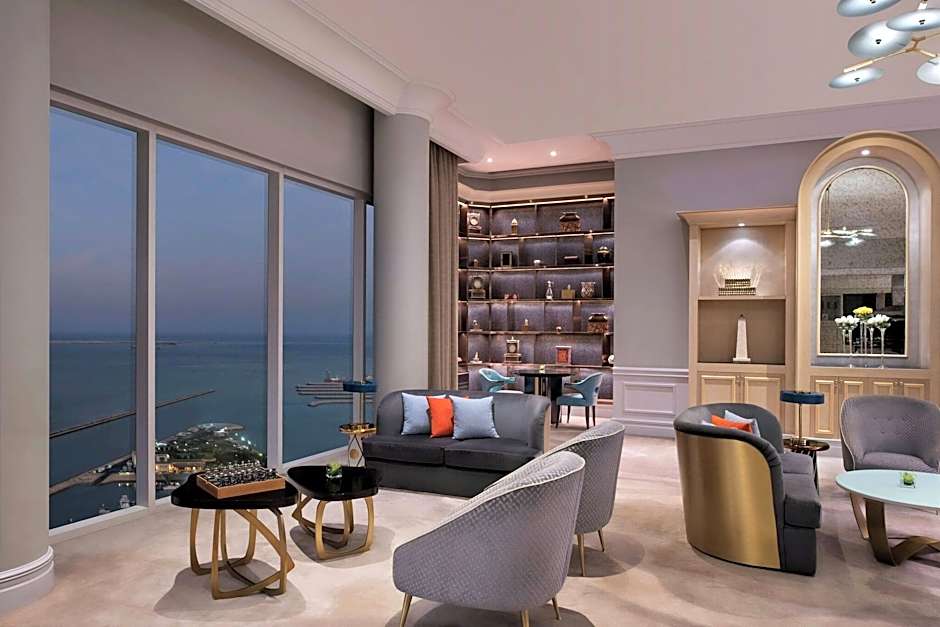 The spacious suite features a private balcony overlooking Doha’s West Bay Lagoon area and an elegant decor. It has a separate lounge and a kitchenette. The suite includes a private bathroom with a hot tub and steam shower, and an extra guest bathroom.