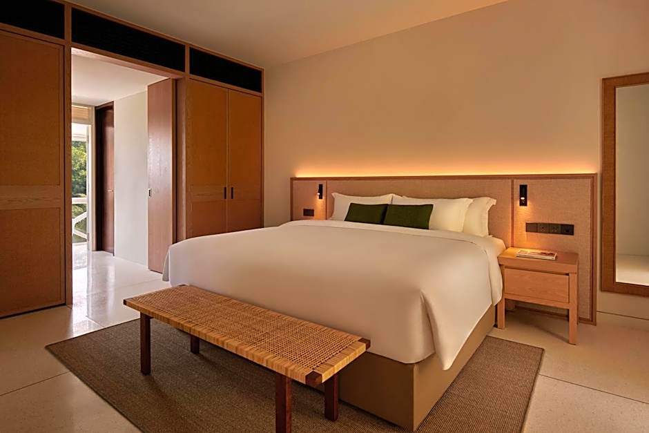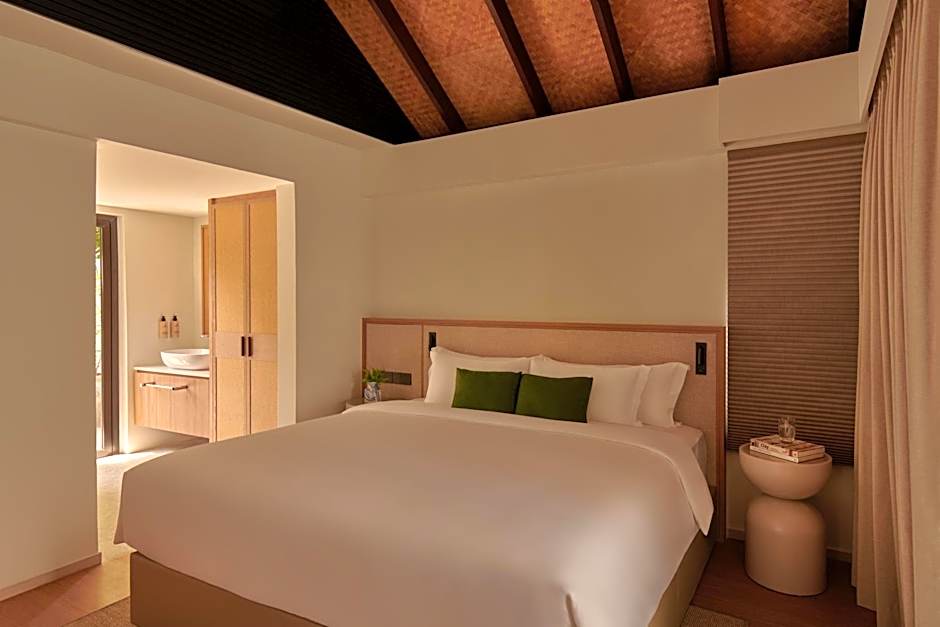 The one-bedroom pool villa includes a living room with sofa bed, spacious bedroom and an outdoor bath amid lush greenery, offering an unparalleled privacy and tranquility.