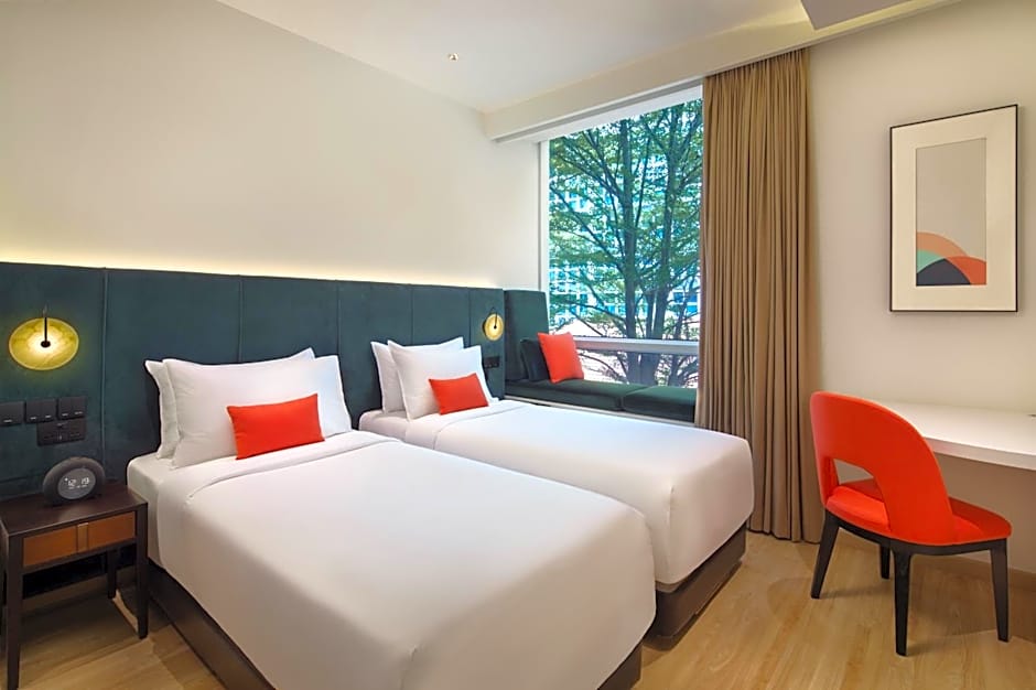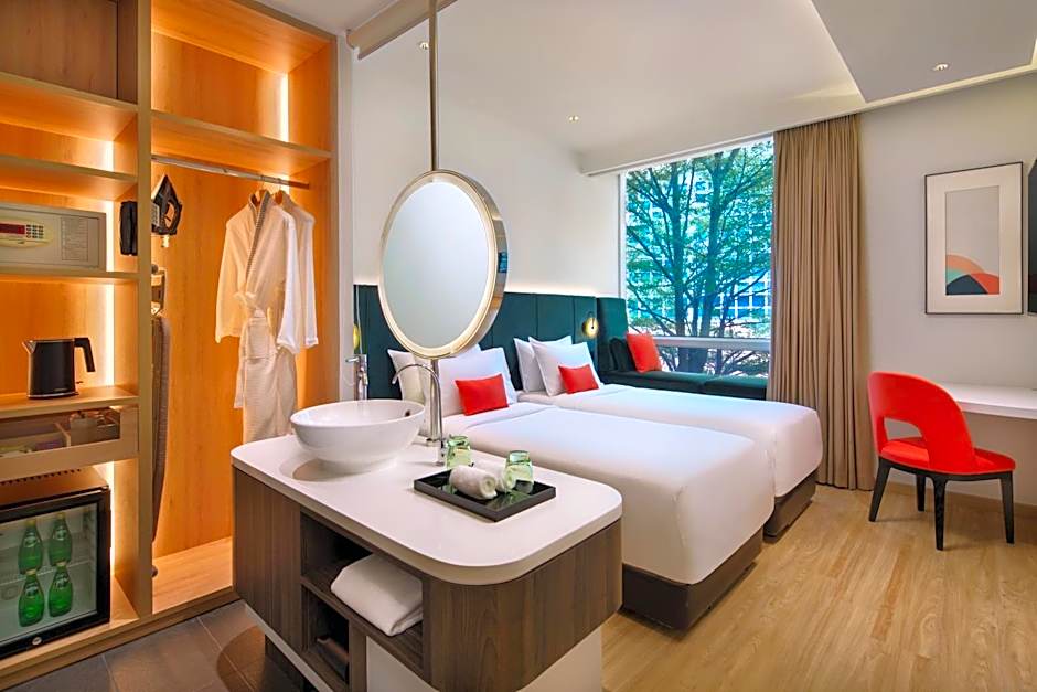 Fitted with floor-to-ceiling windows, this air-conditioned twin room has a seating area equipped with a 42-inch flat-screen cable TV, mini-bar and a desk. The private bathroom includes shower facilities, a hairdryer and free toiletries. Ironing facilities are available.