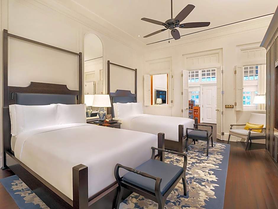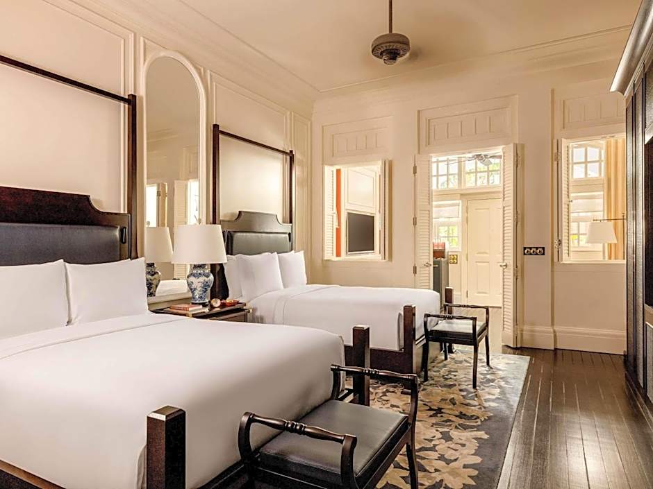 Raffles Singapore offers suites with various bed configurations including two double beds, a king-size bed, or twin beds. Room sizes range from 624 sqft to 753 sqft. All suites are non-smoking and can accommodate up to 3 adults and 2 children.