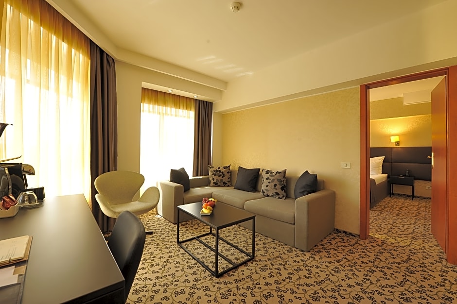 The junior suite consists of a bedroom and a seating area with a modern sofa and a working desk. Free Wi-Fi is available, as well as 2 flat-screen TVs with cable channels, a mini-bar and bathroom amenities.
