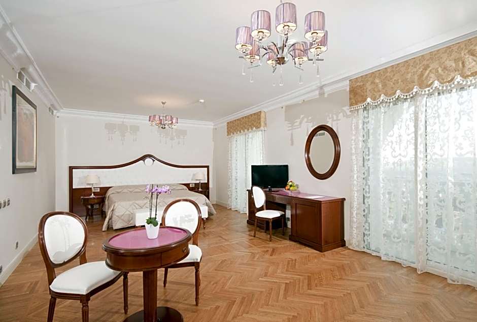 The spacious and elegant suite has two balconies offering views of the city. It features a walk-in closet and a lavish and spacious bathroom with a hot tub and shower.