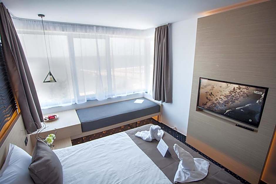The Aqvatonic Hotel - Steaua de Mare offers various types of rooms including Standard Double Rooms, Triple Rooms, Premium Double Rooms with Partial Sea View, Superior Suites, Apartments, Deluxe Double Rooms with Side Sea View, and Double Rooms with Sea View. Smoking is not allowed in any of the rooms. The rooms accommodate either 2 adults and 1 child or 3 adults and 1 child. The bed sizes range from Queen size beds to Twin beds and Sofa beds. The room sizes vary between 151 sqft and 344 sqft.