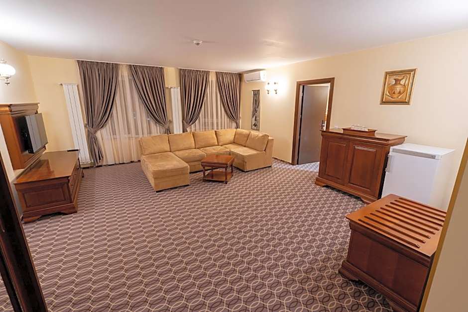 Spacious suite with a bedroom, living room and air conditioning.