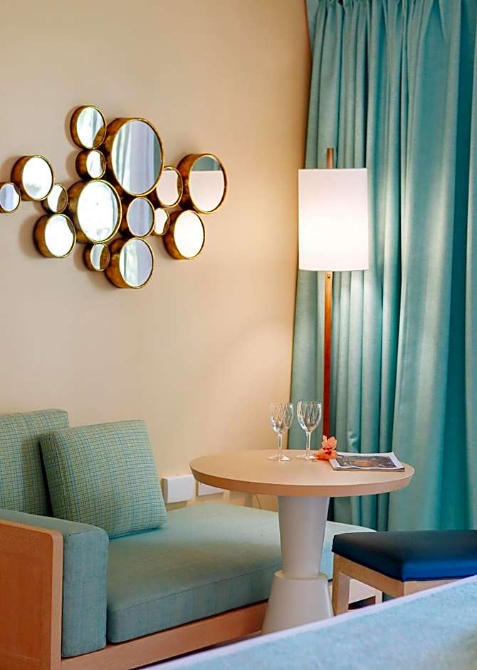 This spacious suite features a separate spacious bathroom with shower and bathtub, offering views over the pool area. There is also a separate living-dining area and a well-equipped kitchen. These rooms are located around the pool and are adapted for disabled guests.