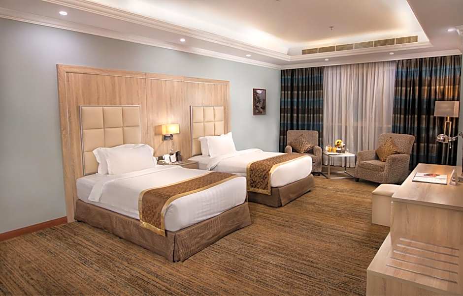 The hotel offers Standard Twin Rooms with a city view, which have two twin beds and can accommodate 2 adults and 2 children. The Executive Suites with a city view have 1 queen-size bed and 1 sofa bed, accommodating 3 adults and 2 children. There are also Standard Double Rooms with a city view, featuring 1 queen-size bed and accommodating 2 adults and 2 children. Lastly, the Junior Suites with a city view have 1 queen-size bed and 1 sofa bed, accommodating 3 adults and 2 children. Smoking is not allowed in any of the rooms.
