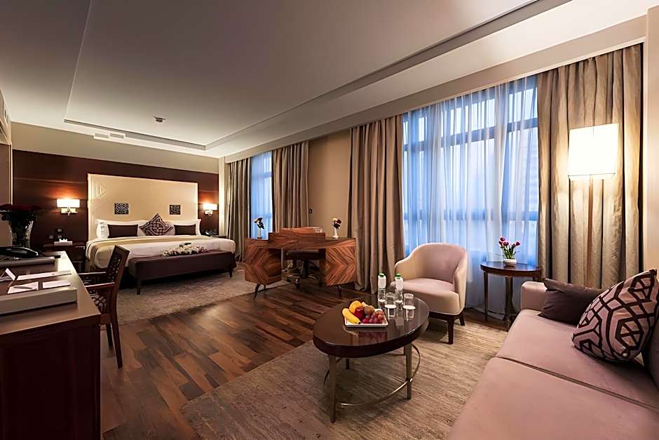 The suite features a city view, one king size bed with an attached bathroom with a bathtub, and a separate living room with a bathroom and dining table. The suite also features central air conditioning, a sofa bed, free WiFi, a media hub and an LCD TV screen, as well as a mini fridge, a shower with a smart control panel for the shower, an outside room display on the room TV through a built-in camera, an electric curtain, and a control panel for do not disturb and make up signs. The suite also features an auto door open button, tea and coffee hospitality tray and a Digital Safe box.