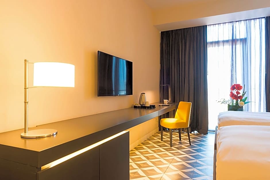 The hotel offers standard double or twin rooms with balcony and pool view, junior suites, and suites with balcony and whirlpool. The rooms accommodate 2 adults and 1 child, and smoking is not allowed. Bed sizes vary from queen size in standard rooms to the same in the suites. Room sizes range from 291 sqft for standard rooms to 915 sqft for suites.